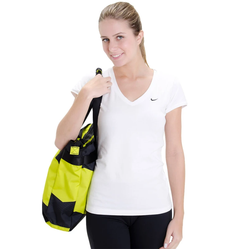 Medidas da modelo Larissa que usa a Bolsa Nike Field Tote nas cores: Preto e Verde/Preto