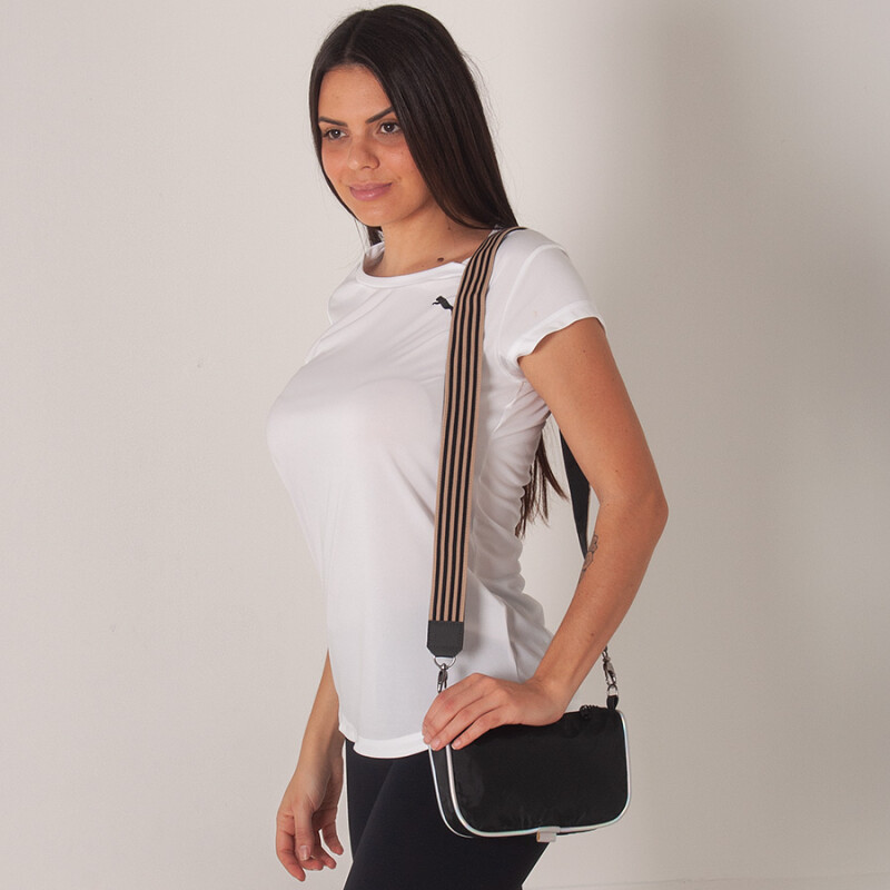 Confeccionada em 100% nylon, material sintético, com alça listrada e vivo prateado finalizando a peça.