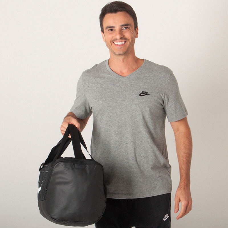 Medidas do modelo Julian que usa a Bolsa Nike Duffel Brasilia Pequena nas cores: Preto/Branco e Marinho/Branco