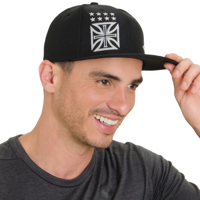 Confeccionado em poliéster, possui aba reta, fechamento ajustável, logo da marca e brasão na frente do boné.