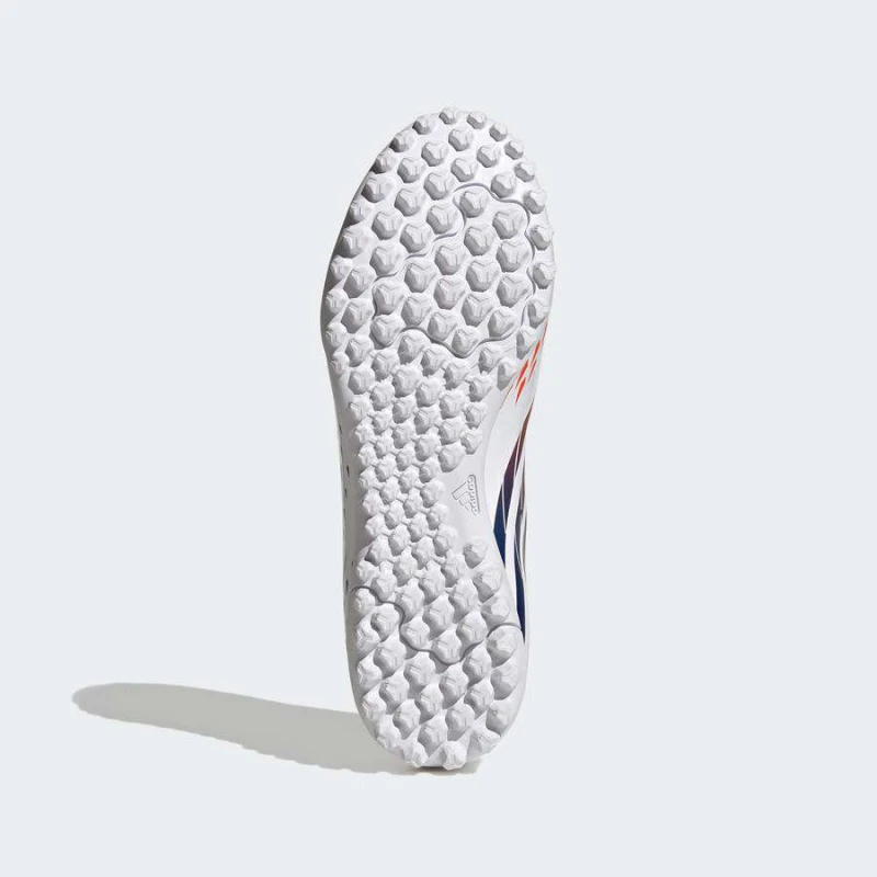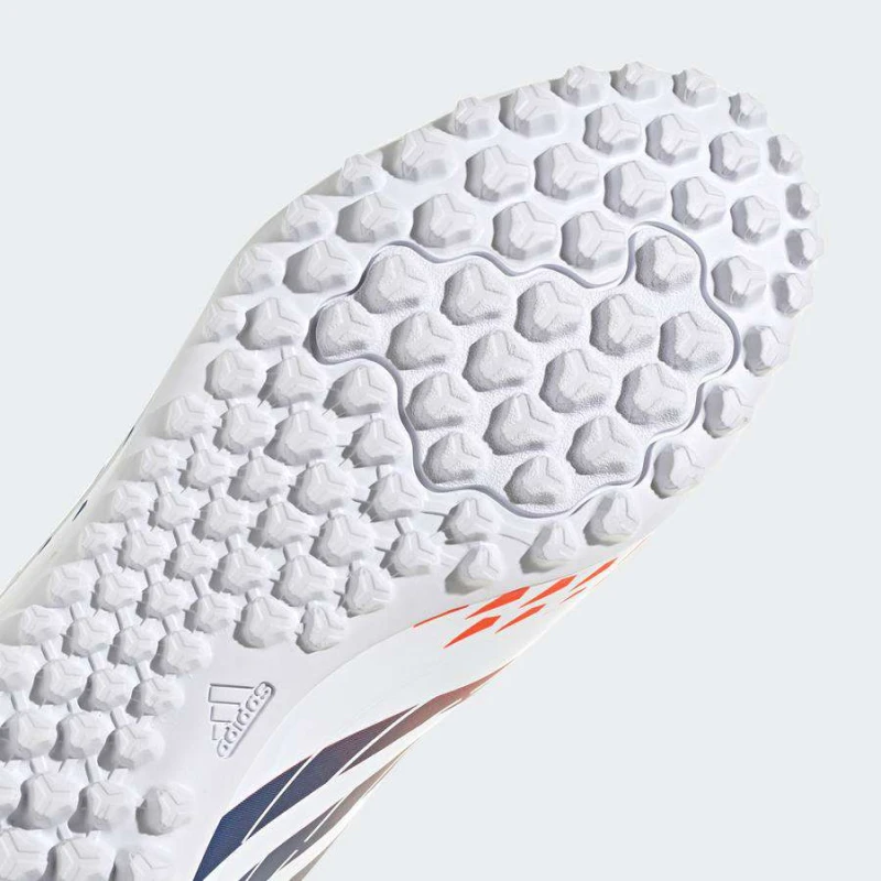 Por baixo, o solado de borracha com sulcos adere ao campo de grama sintética para ajudar a dominar o jogo.