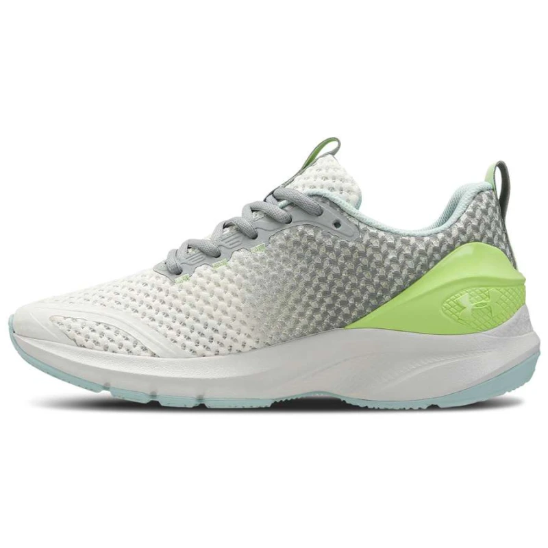 O Tênis de Corrida Feminino Under Armour Charged Prompt possui o cabedal em gáspea confeccionada em tecido de poliéster com aplicação de serigrafia degradê.