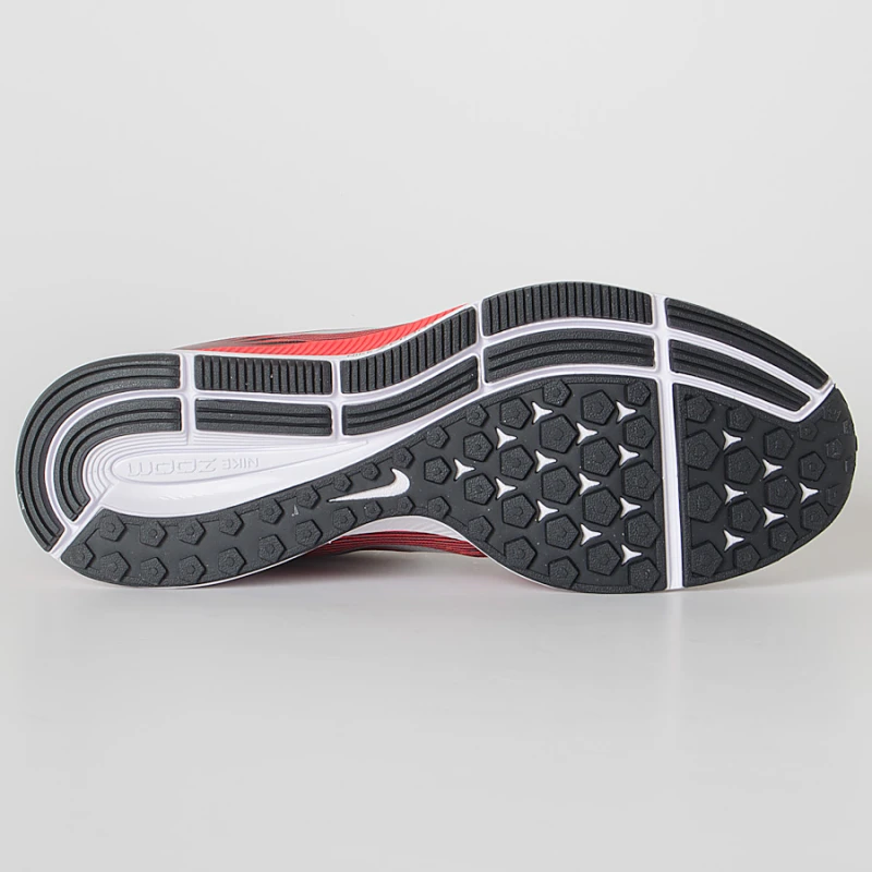 O solado é feito em borracha padrão Waffle que aumenta a tração e estabilidade, conta ainda com a tecnologia Nike Zoom Air no calcanhar que proporciona uma corrida macia e responsiva.