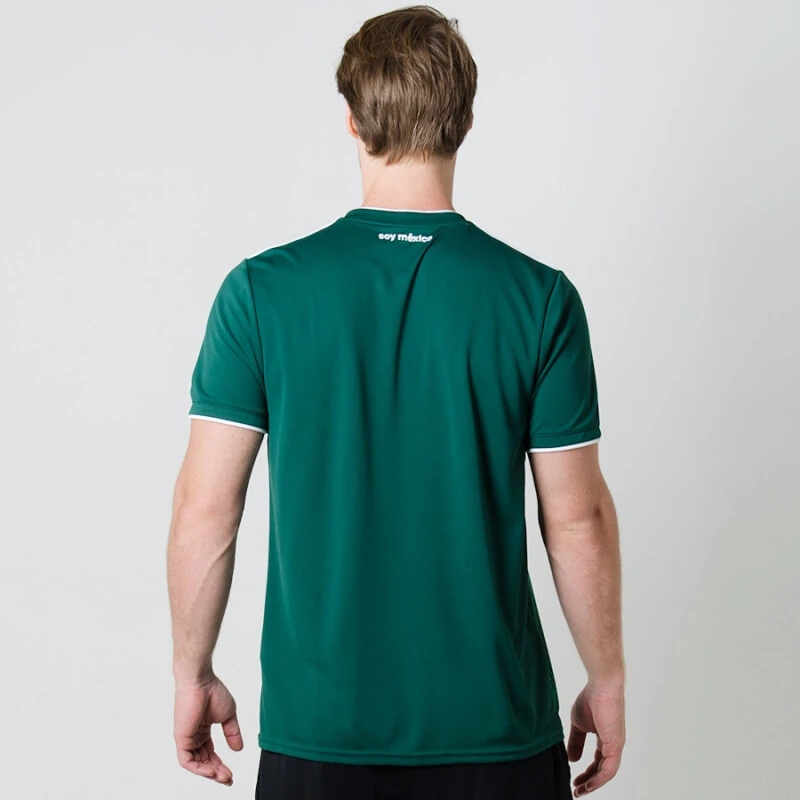 Além disso, o escudo da Federação Mexicana aparece bordado no tórax, assim como o logo da adidas e, nas costas, logo abaixo da nuca, a inscrição "Soy México" pode ser vista.