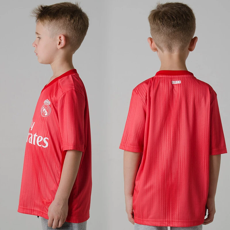 Além disso, traz arte corrida estampada por dispersão, gola careca canelada, "For the Oceans" estampado na tira atrás da gola, escudo do Real Madrid no peito, "RMCF" abaixo da gola, na parte de trás.