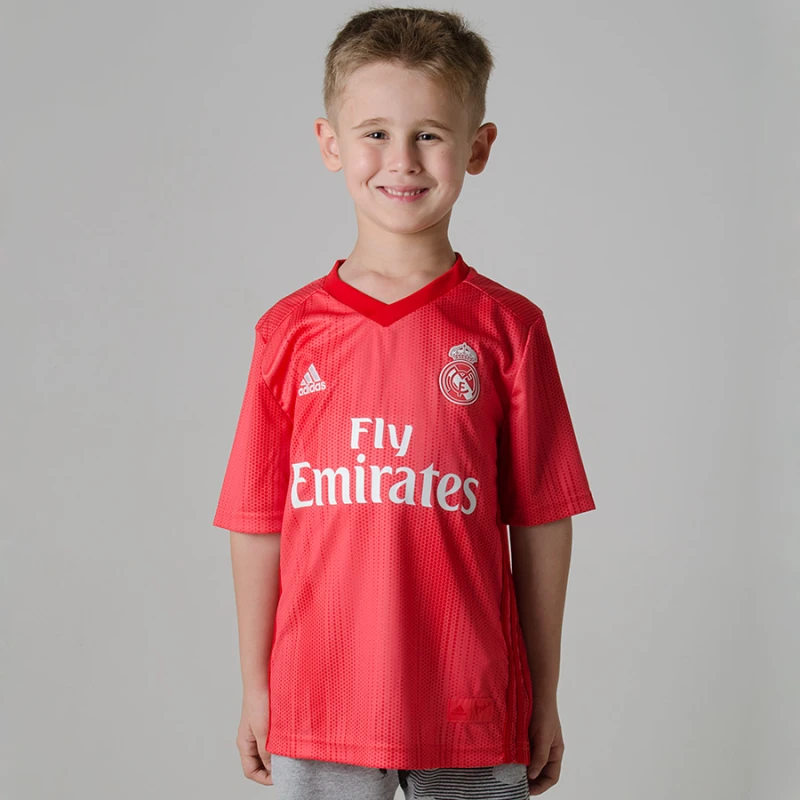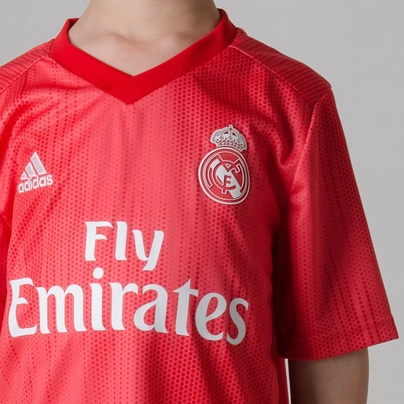 A Camisa adidas Real Madrid Oficial 3 2018/19 Sem Número Infantil é confeccionada com fios derivados de plástico coletado em praias e comunidades costeiras antes de chegar aos oceanos.