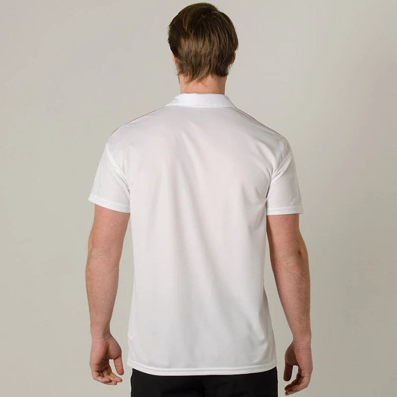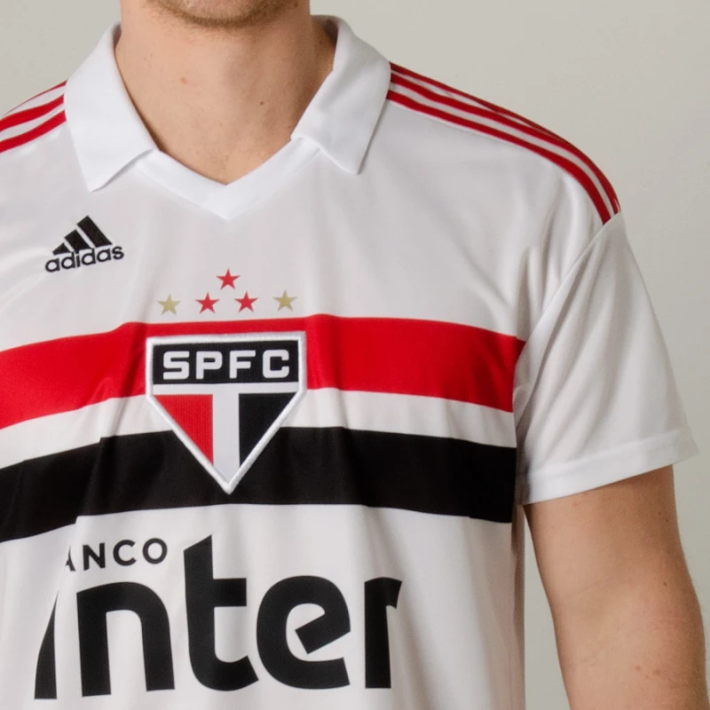 A Camisa adidas São Paulo Oficial 1 2018 Sem Número há ainda as listras da marca fornecedora presentes nos ombros e por fim, a gola é polo com corte V.
