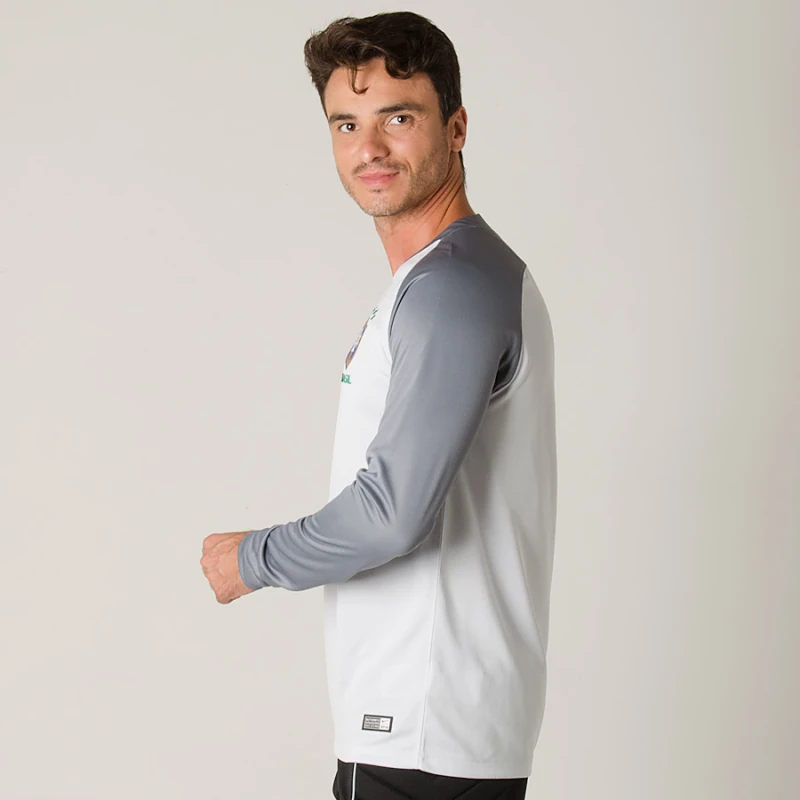 A linha da gola possui menos costuras para uma sensação de maciez na pele, além de mangas raglã que permitem amplitude natural de movimentos e fita na parte de trás para conforto.