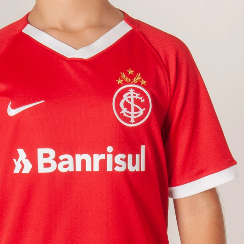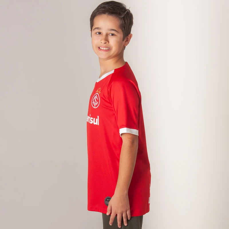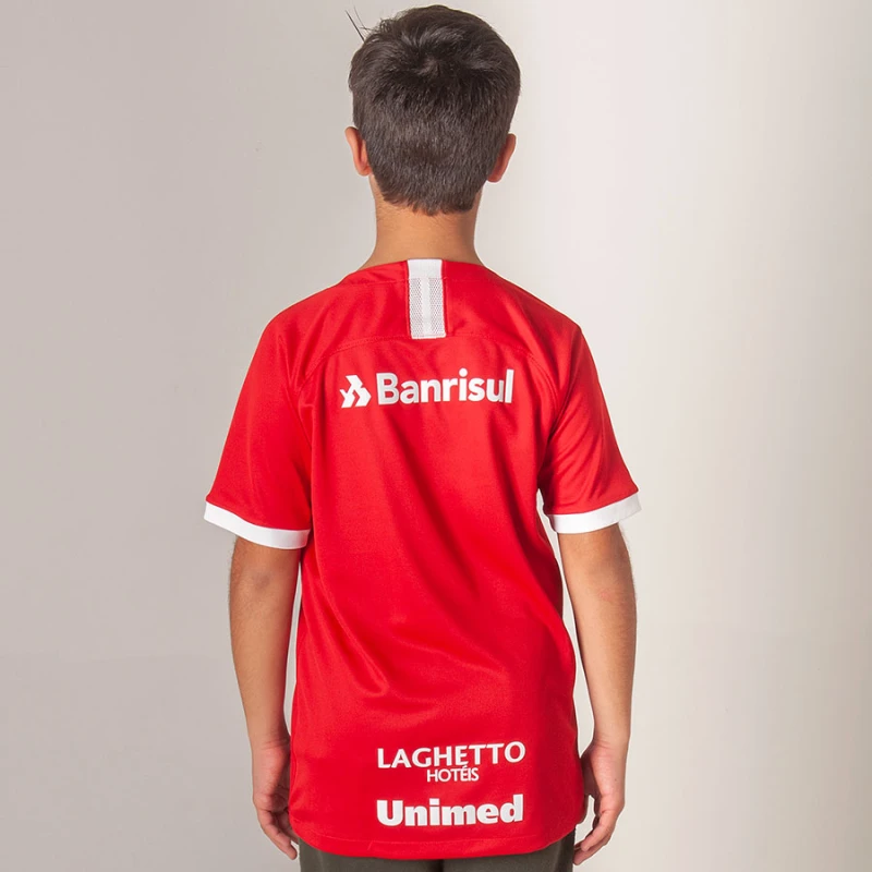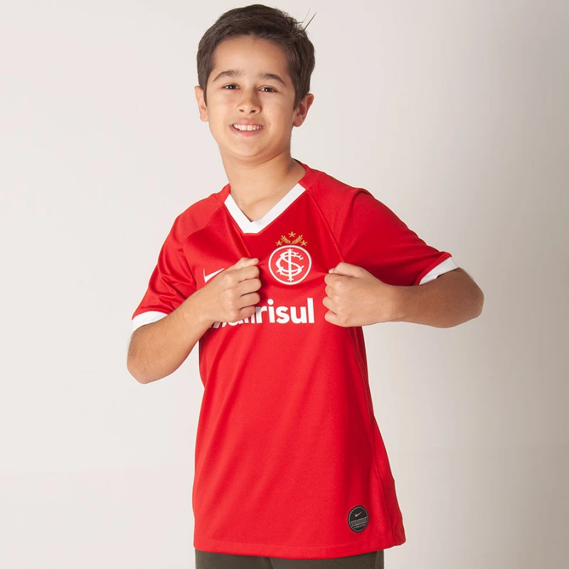 A Camisa Nike Internacional Oficial 1 2019/20 Sem Número Infantil respeita a história e é predominantemente vermelha com detalhes brancos nas mangas e na gola em "V", seguindo o modelo usado pelo Colorado na época.