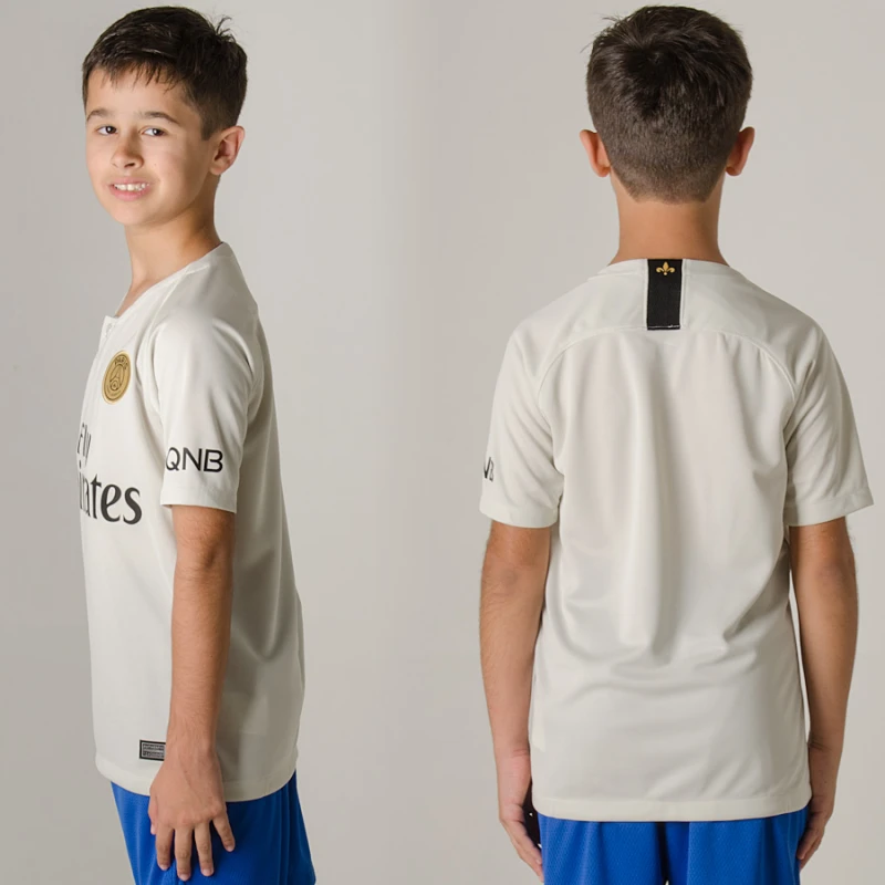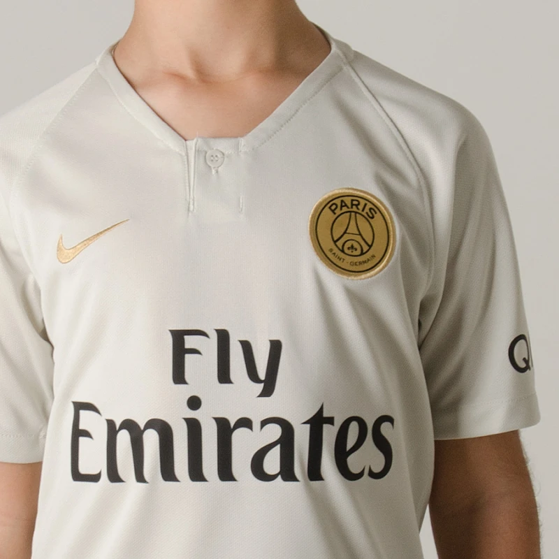 Com a neutralidade do bege e o requinte do tom dourado no escudo do clube francês, a Camisa Nike Paris Saint Germain Oficial 2 2018/19 Sem Número Infantil é a maior inspiração para os torcedores que admiram o PSG treinarem o bate-bola e vestirem nas diversas ocasiões do cotidiano.