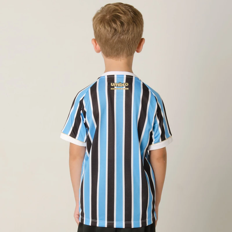 A Camisa Umbro Grêmio Oficial 1 2018 Sem Número Infantil segue o padrão clássico, com listras mais finas presentes em toda a camisa, incluindo mangas, enquanto o punho recebe aplicação de arte embossing, textura com padronagem exclusiva para o time gaúcho.
