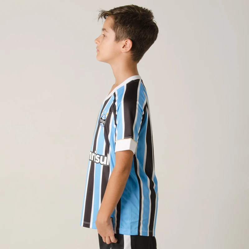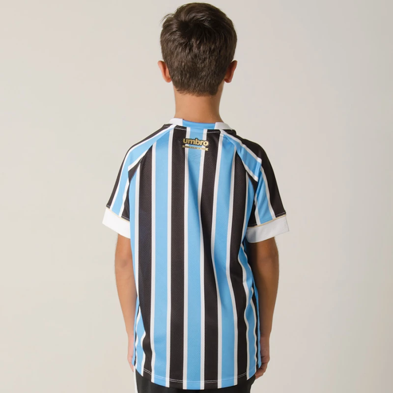 A Camisa Umbro Grêmio Oficial 1 2018 Sem Número Infantil segue o padrão clássico, com listras mais finas presentes em toda a camisa, incluindo mangas, enquanto o punho recebe aplicação de arte embossing, textura com padronagem exclusiva para o time gaúcho.