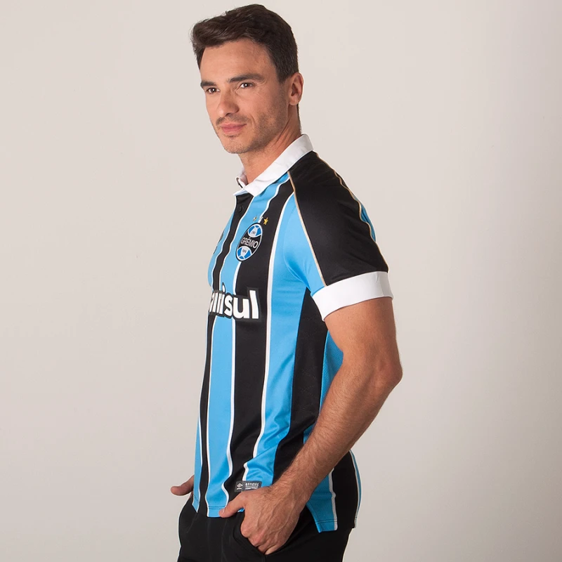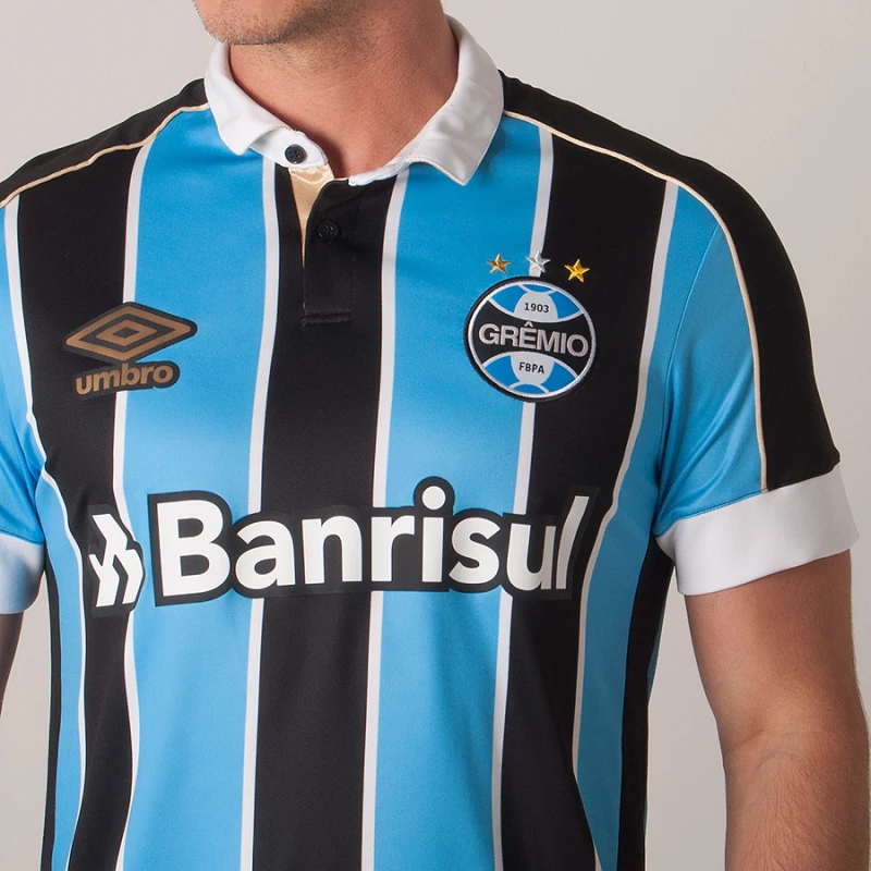 Há ainda, estampa de patrocínio pela composição e próximo a barra traz um selo com a descrição "Grêmio o clube de todos".