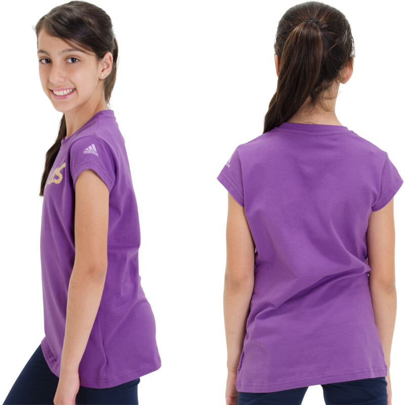 Medidas da modelo Letícia Pereira que veste a Camiseta Adidas Linear Girls nas cores: Lilás, Pink e Roxo