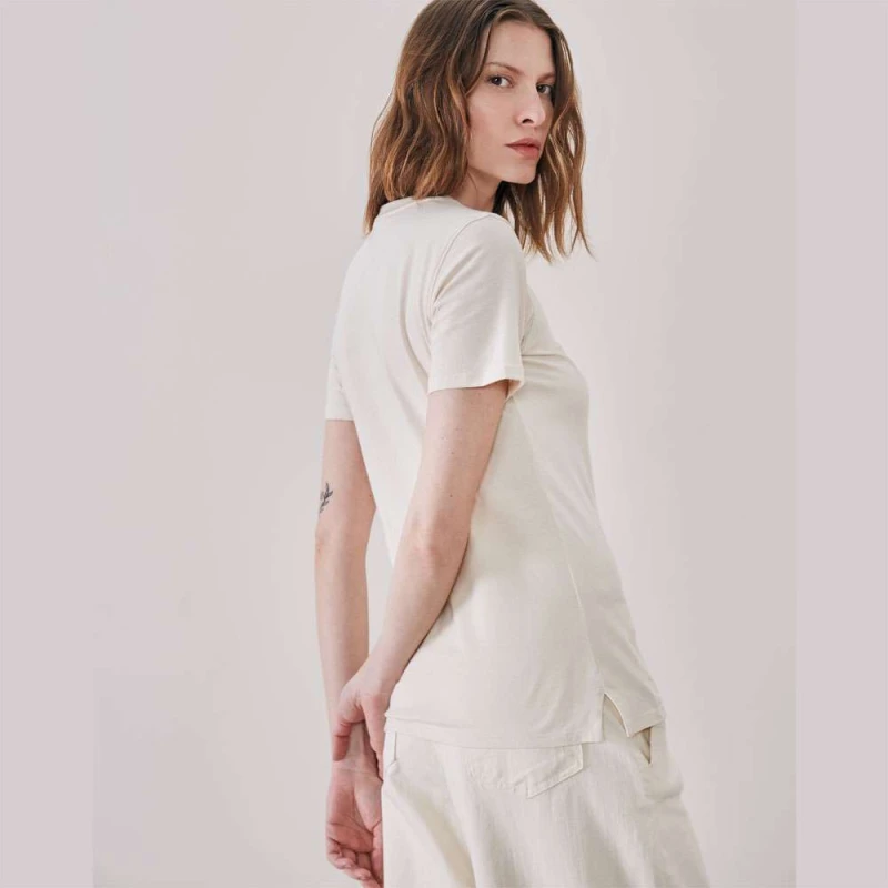 Camiseta com manga curta confeccionada em malha de algodão, modelagem regular com gola em ribana, fendas laterais e acabamentos de pesponto nas cavas, punhos e gola.