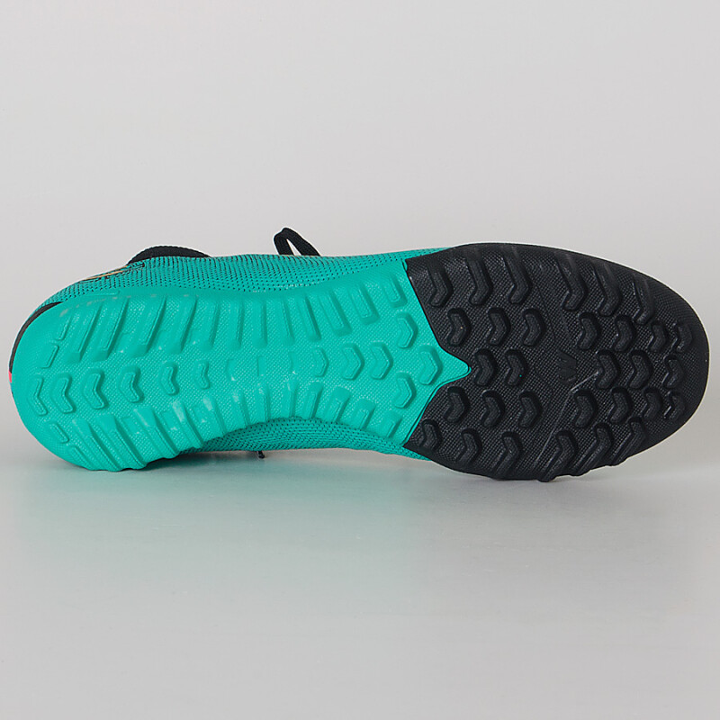 Já o solado para gramados (TF) com travas de borracha garante maior tração em superfícies sintéticas.