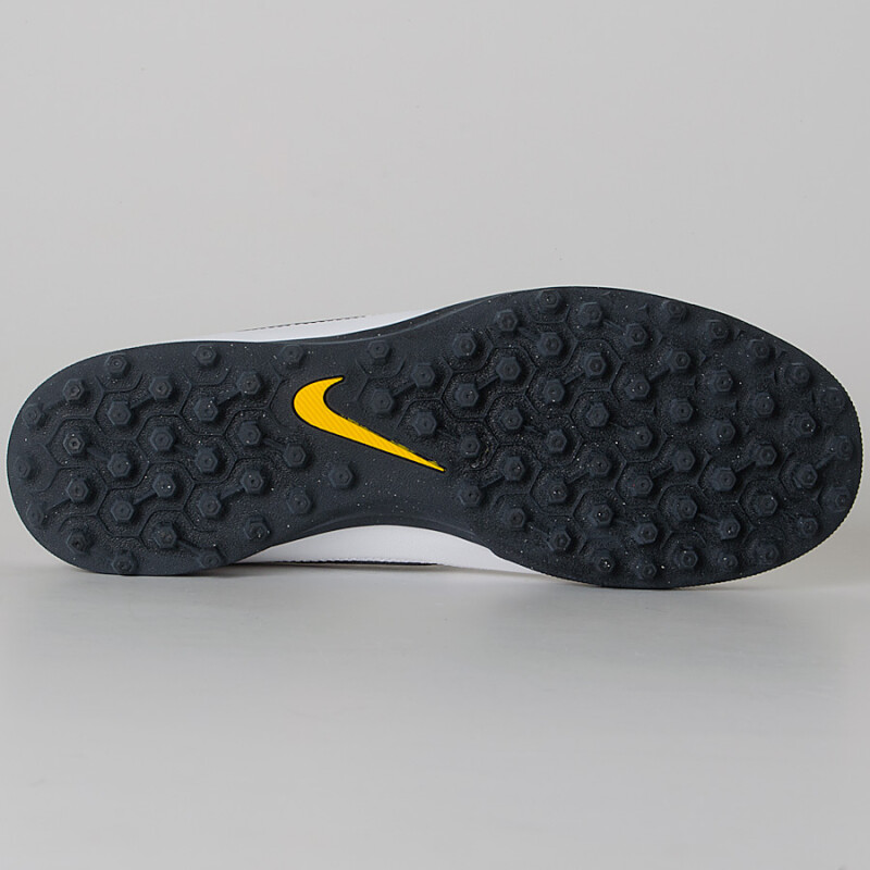 Solado em TPU de alta tração em quadras/campos de grama sintética e travas fixas.