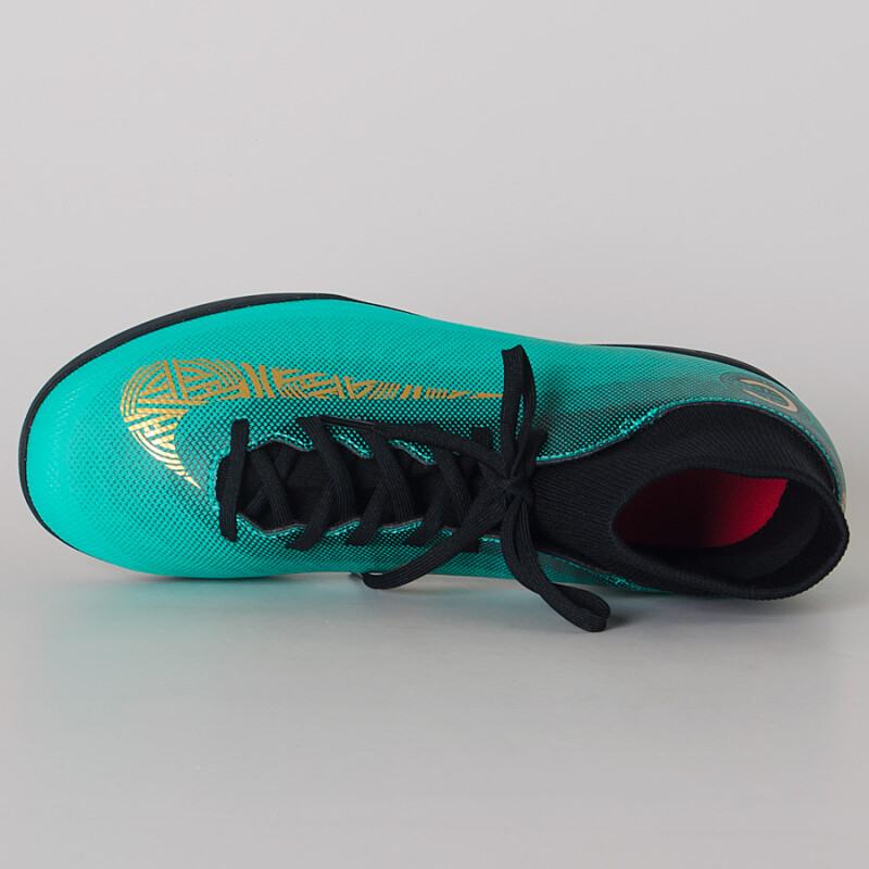 Com solado e travas baixas em borracha, a Chuteira Nike CR7 MercurialX Superfly 6 Club TF proporciona maior tração e agilidade dentro das quadras sintéticas.