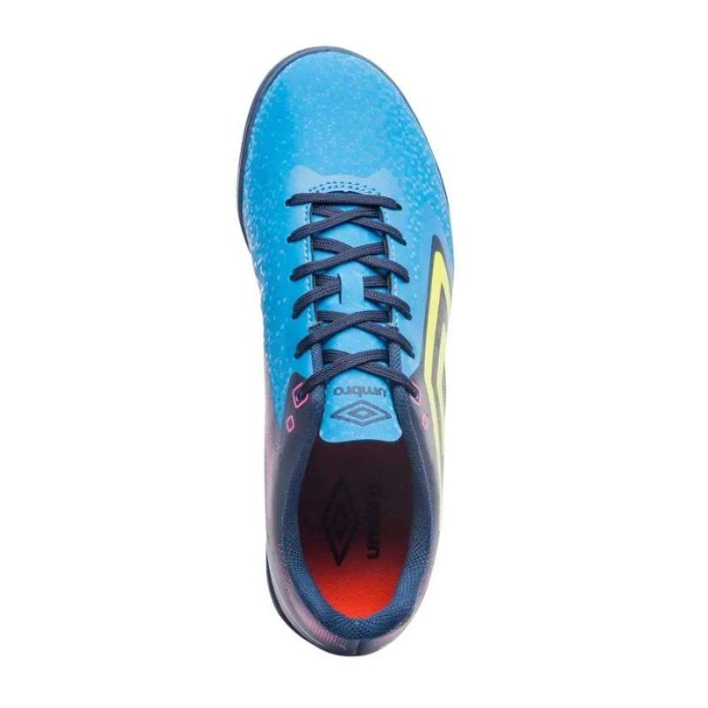 A Chuteira Society Umbro Techno II apresenta design com efeito pixel em fosco ? brilho. Seu cabedal é confeccionado em material laminado com textura plana e contraste, combinado com arte gráfica em serigrafia e elementos em cores contrastantes. Possui palmilha interna macia, confeccionada em EVA e forrada em tecido, garantindo conforto durante o jogo. O solado de futebol society HG é feito em PVC com sistema de travas em barra e chevron.