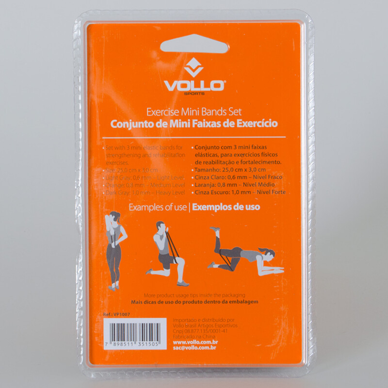 O Conjunto de Mini Faixas de Exercício Vollo é composto por três mini faixas elásticas em forma de anel, com intensidades diferentes que possibilitam a realização de exercícios em diversos grupos musculares, cinza claro (nível fraco), laranja (nível médio) e cinza escuro (nível forte).