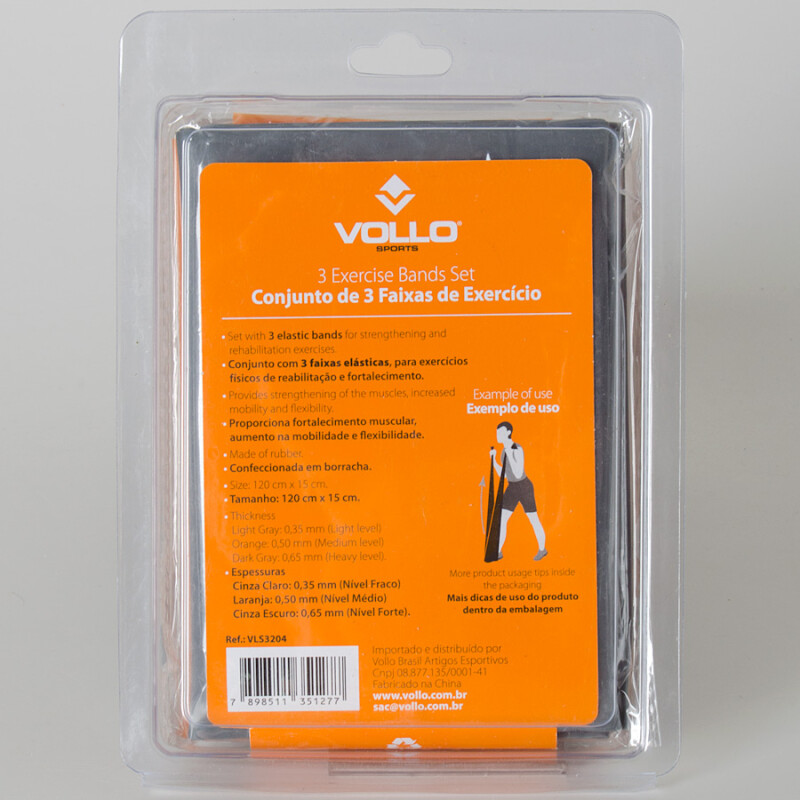 O Conjunto Vollo de Faixas Elásticas é composto por três faixas com diferentes intensidades.
