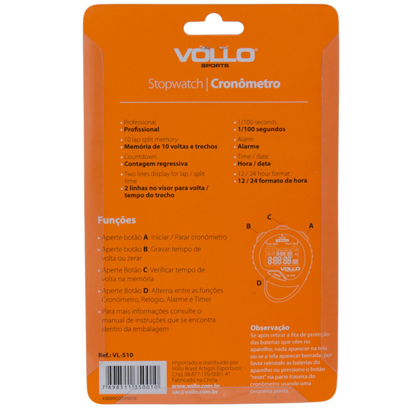 O Cronômetro Vollo 10 Recall 10 Memory é um acessório indispensável para as atividades físicas, ideal para monitoração de treinos.