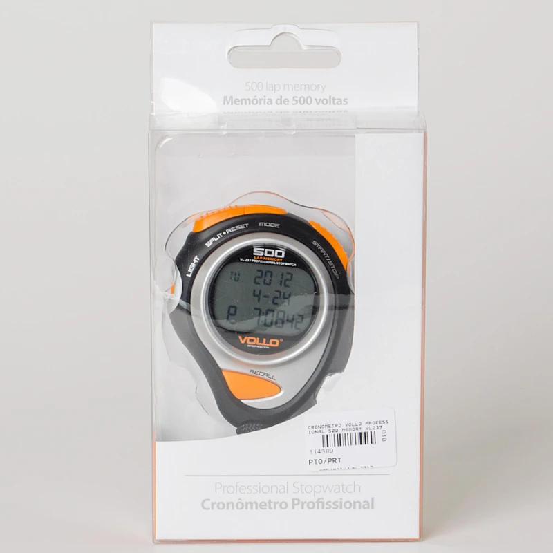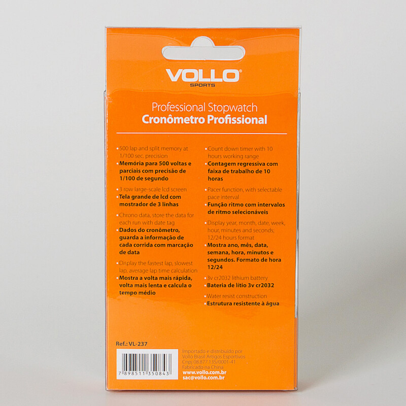 O Cronômetro Vollo Professional 500 Memory possui memória para 500 voltas, tela grande de LCD com mostrador de 3 linhas, contagem regressiva, função ritmo com intervalos de ritmo selecionáveis, formato de hora 12/24, bateria de lítio, estrutura resistente a água e iluminação.