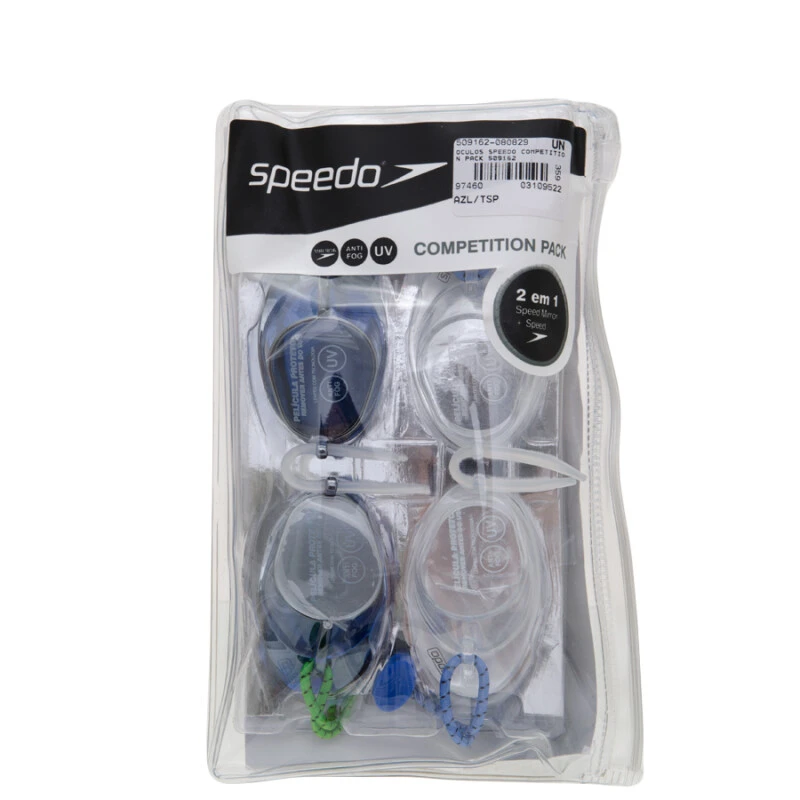 O Óculos Speedo Competition Pack é composto por dois óculos de natação, sendo um em azul e outro incolor.