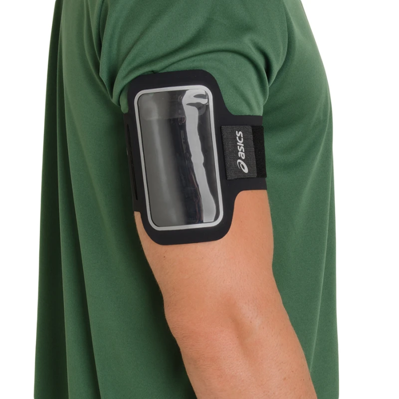 O novo Porta Acessório Asics Plug N Play Armband em neoprene, tela touchscreen transparente, bolso para chave e detalhes refletivos.