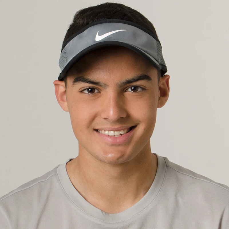 Medidas do modelo Julian que usa a Viseira Nike Aerobill Featherlight nas cores: Branco/Preto e Marinho