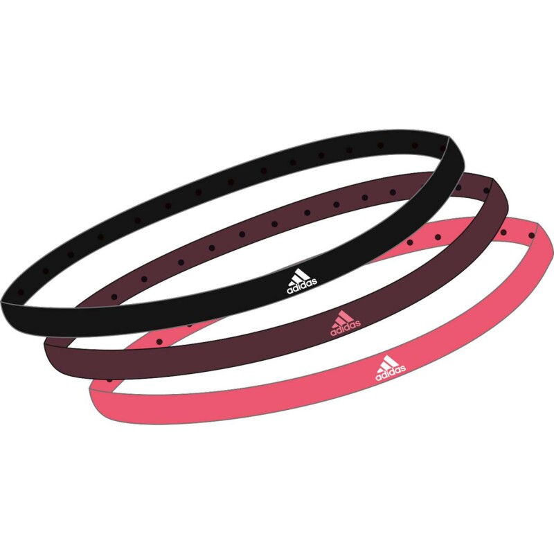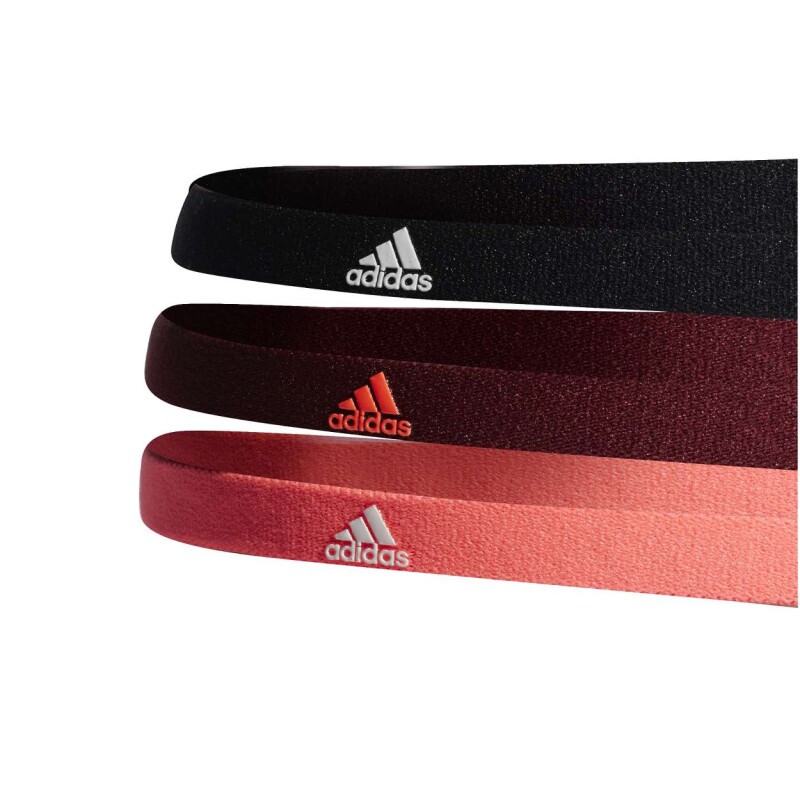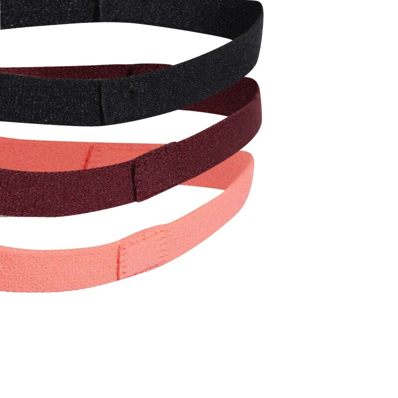 Um pacote de três faixas de cabelo finas e elásticas em várias cores.