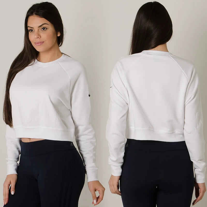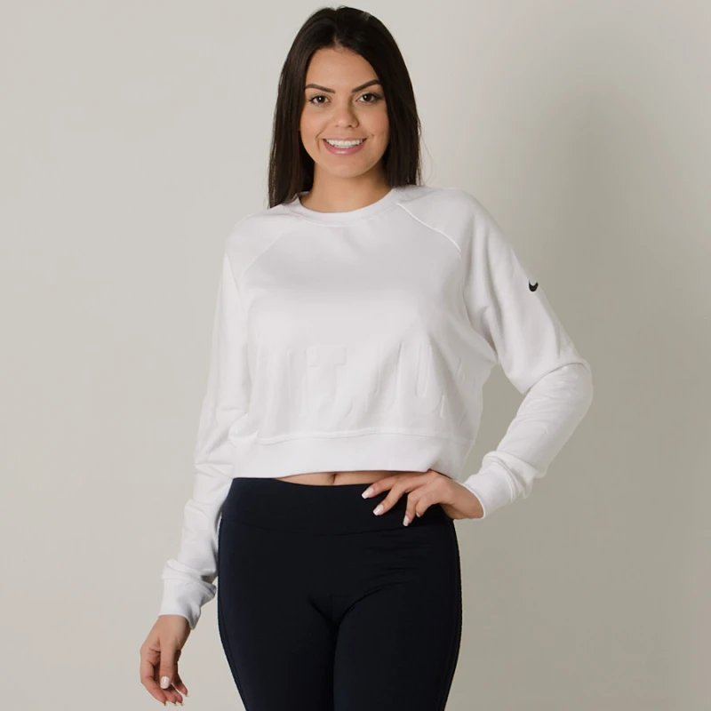 A Blusa Nike Versa Feminina possui perfil cropped que permite fácil composição das camadas.Confeccionada em 54% poliéster e 46% algodão (corpo), 71% algodão, 26% poliéster e 3% spandex (punho).