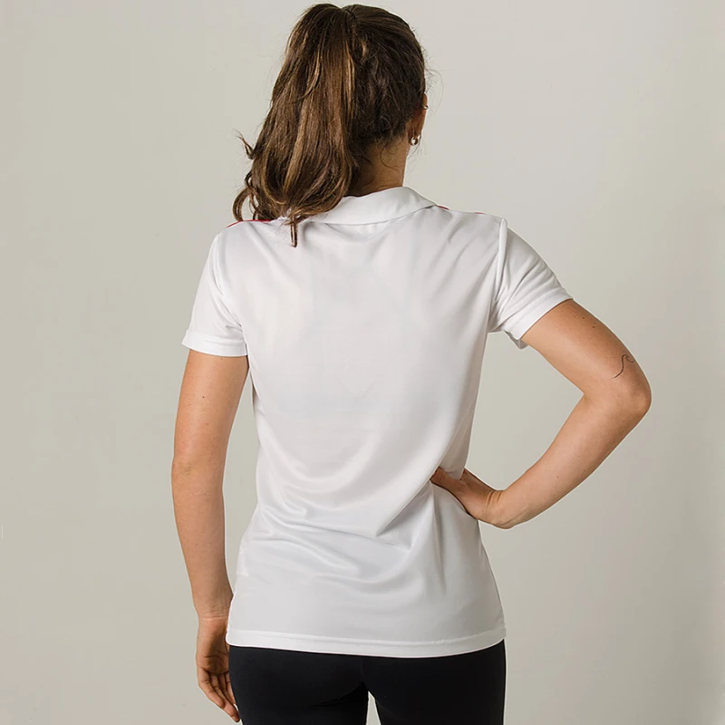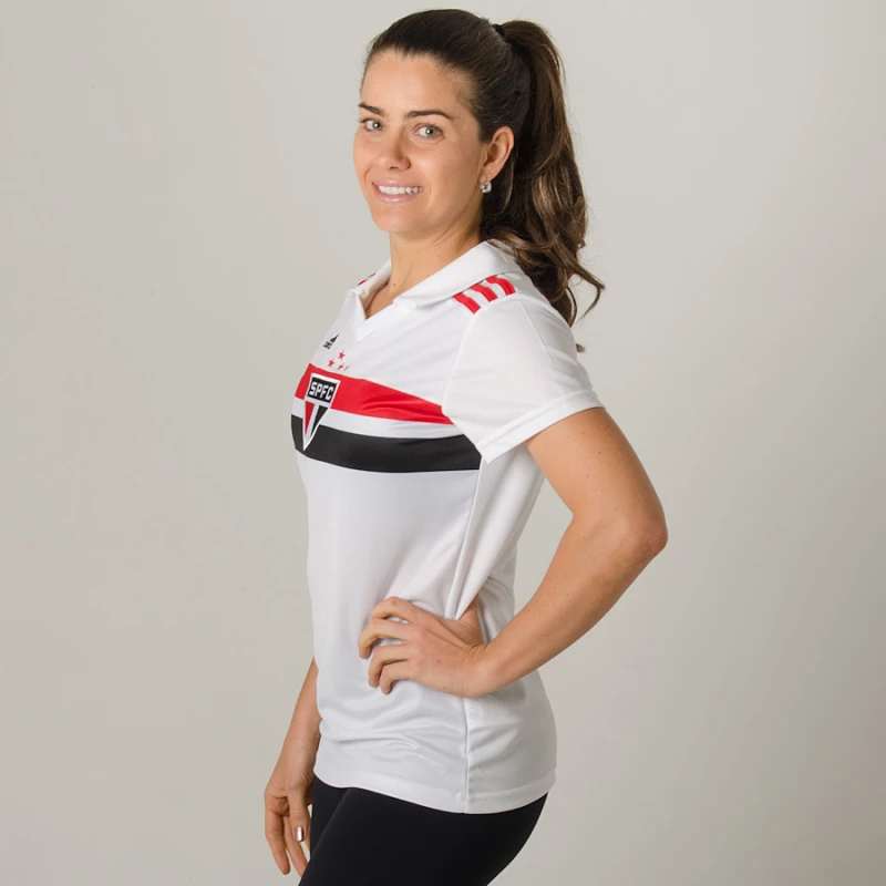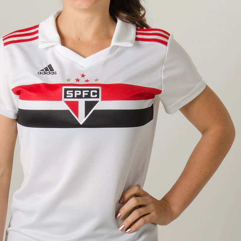 A Camisa adidas São Paulo Oficial 1 2018 Sem Número Feminina há ainda as listras da marca fornecedora presentes nos ombros e por fim, a gola é polo com corte V.