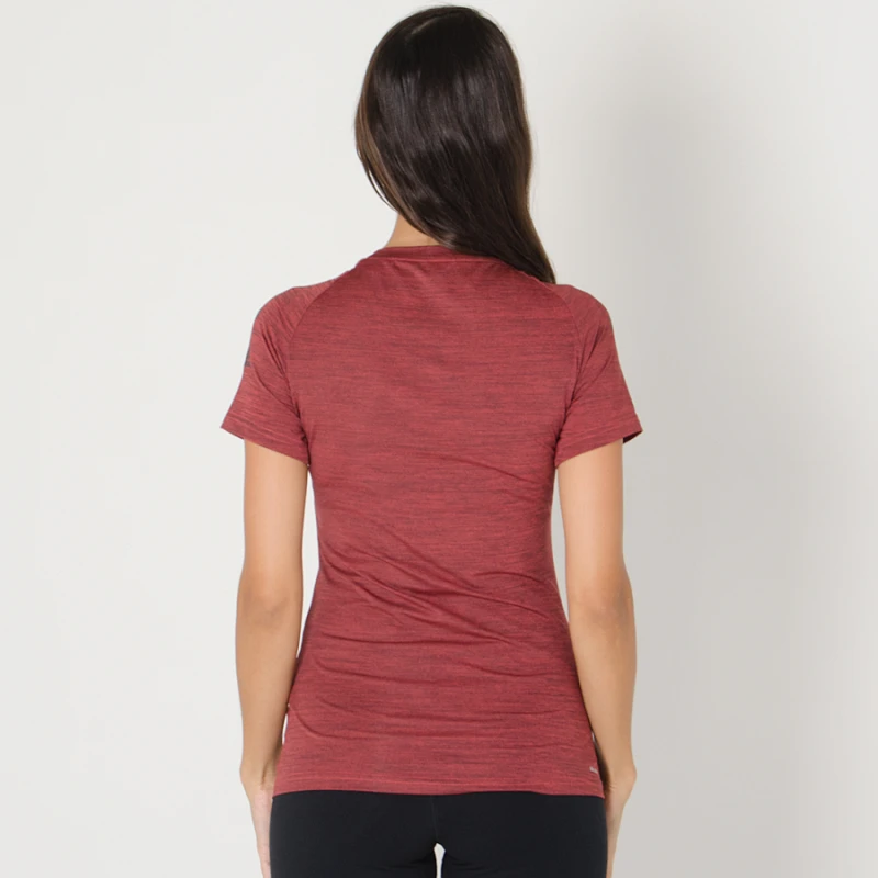 Possui caimento justo, mangas curtas, decote redondo e modelagem que facilita a movimentação na atividade esportiva.