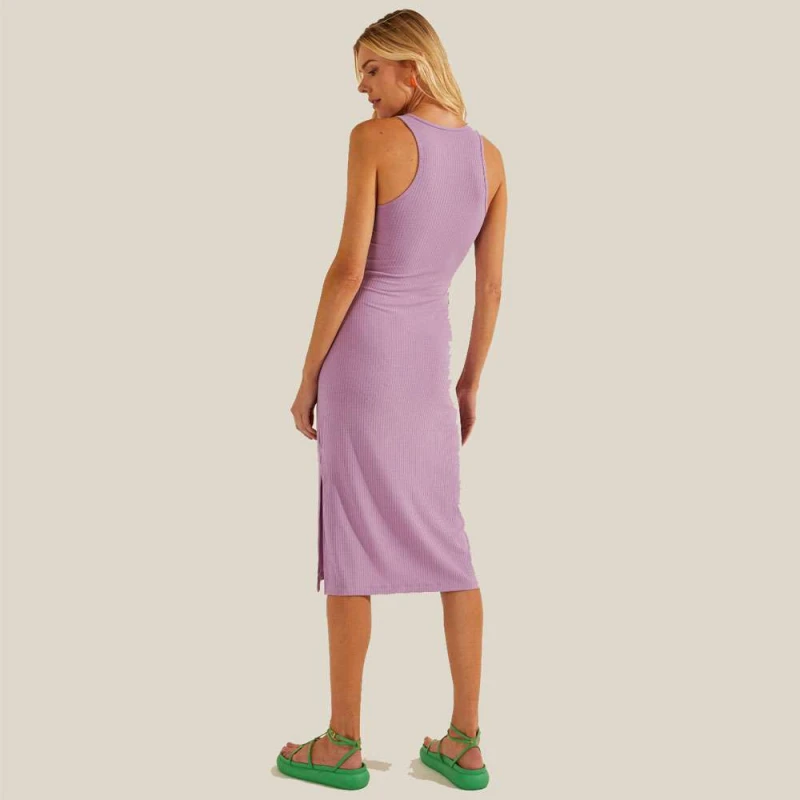 A peça possui textura canelada, decote arredondado com laterais cavadas, estampa de logo minimalista na altura do peito e comprimendo midi com fendas laterais.