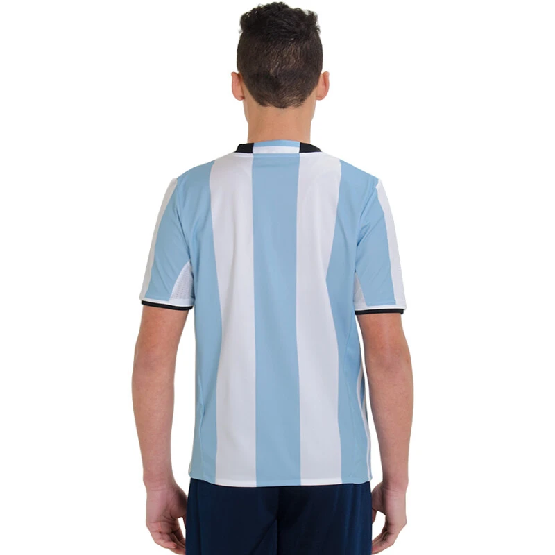 Possui gola careca canelada, painéis frontais e traseiros estampados, relevo tonal na manga direita e escudo da Associação Argentina de Futebol bordado do lado esquerdo do peito.