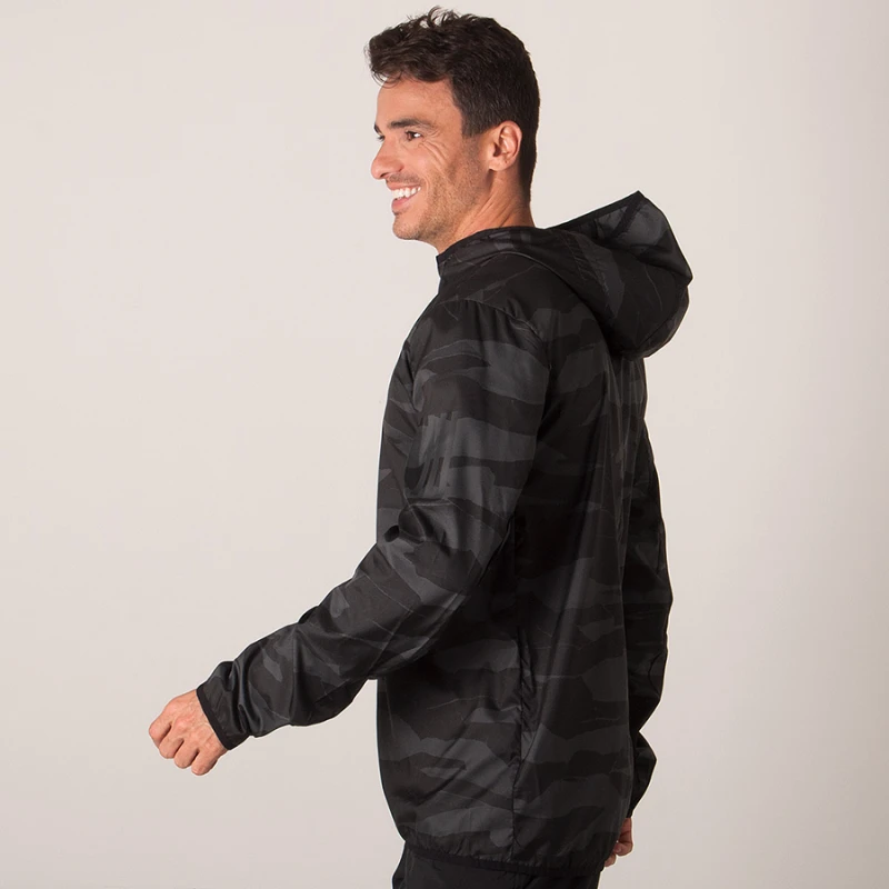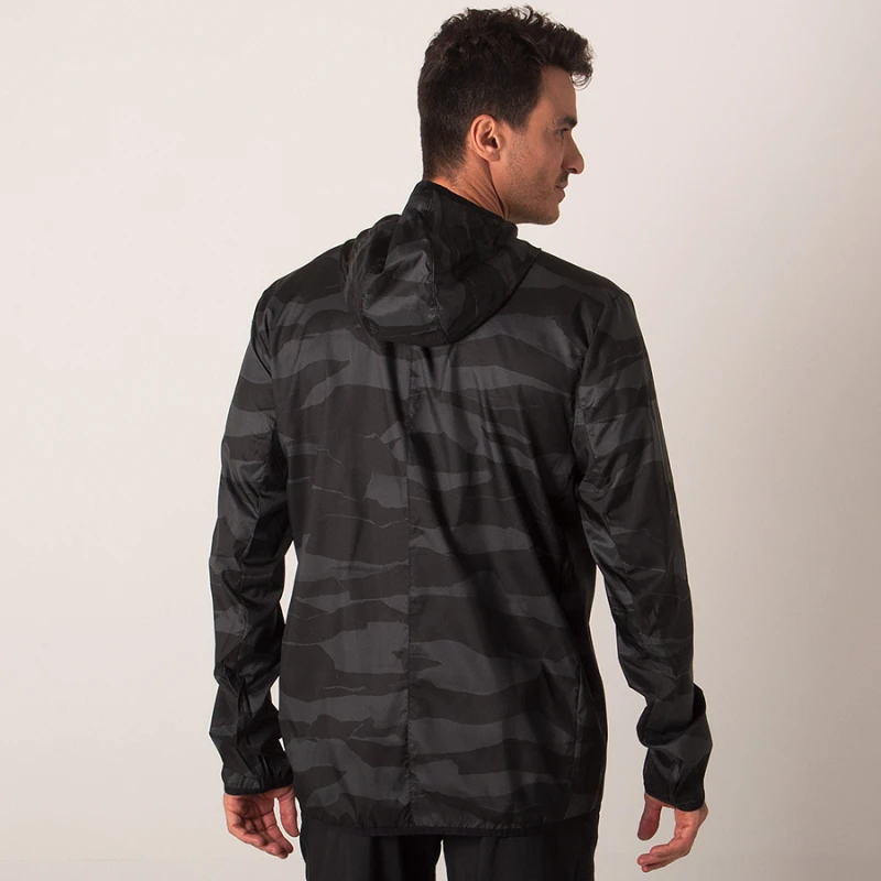 O acabamento antiumidade protege contra a chuva fina, e um bolso antissuor com zíper vertical no peito, permite armazenar pequenos itens.