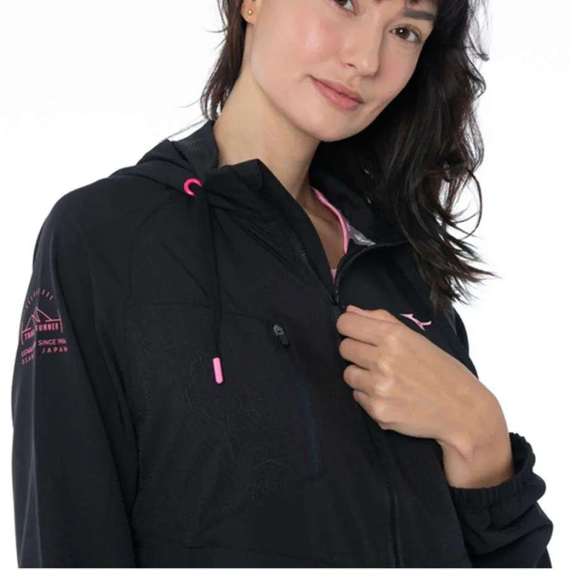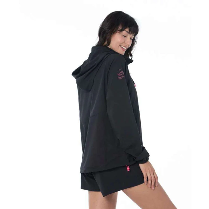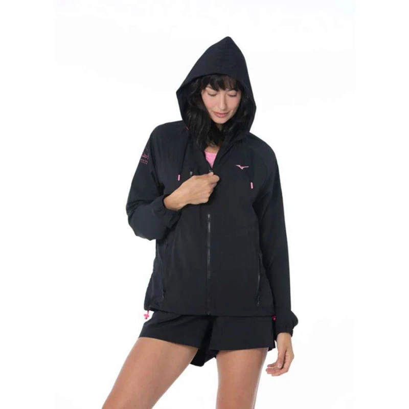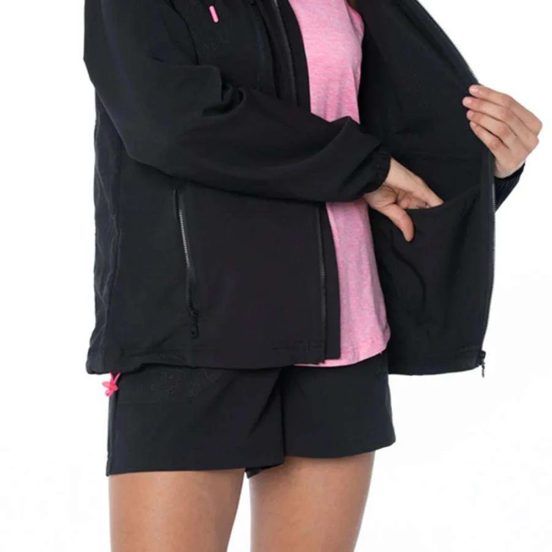 Jaqueta em tecido plano texturizado de poliéster com elastano, cava raglan e capuz.