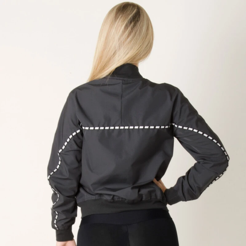Confeccionada em poliéster e malha canelada em algodão e elastano na gola, punhos e barra.