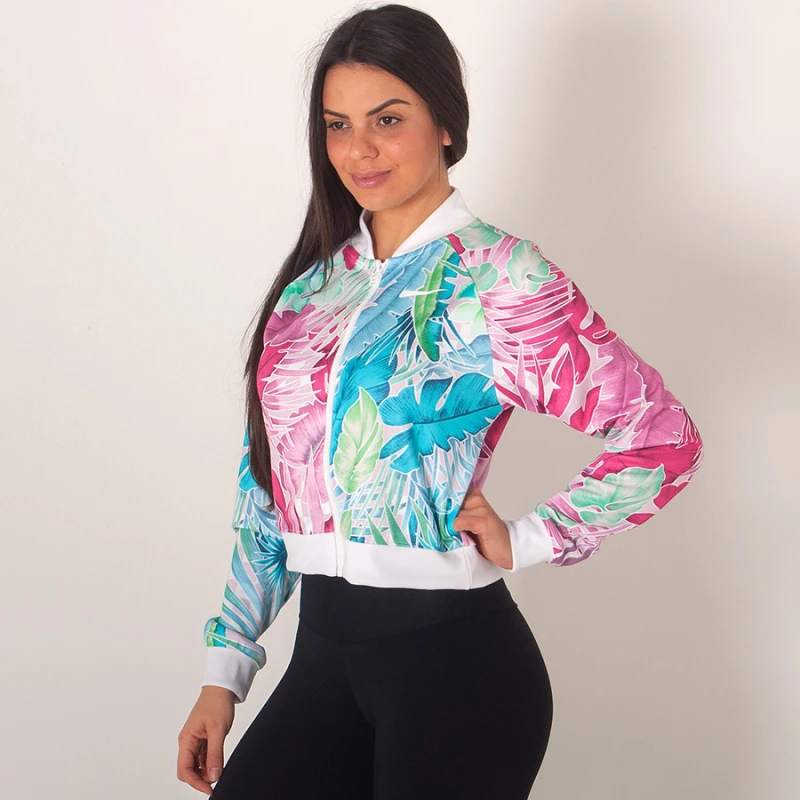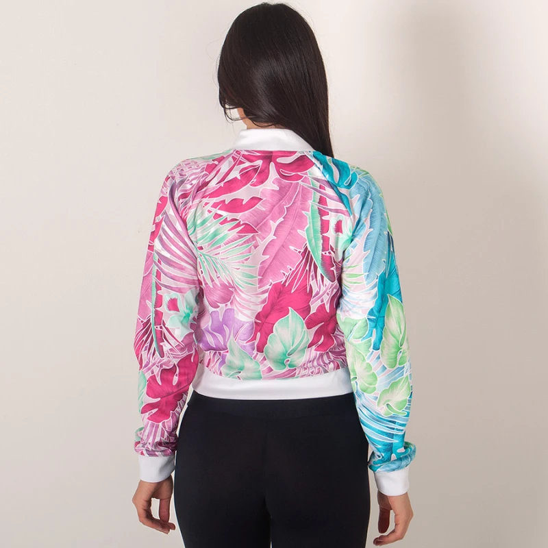 A Jaqueta Nike Sportswear Hyperflora Feminina possui detalhes reforçados e uma estampa divertida, inspirada no tema tropical.
