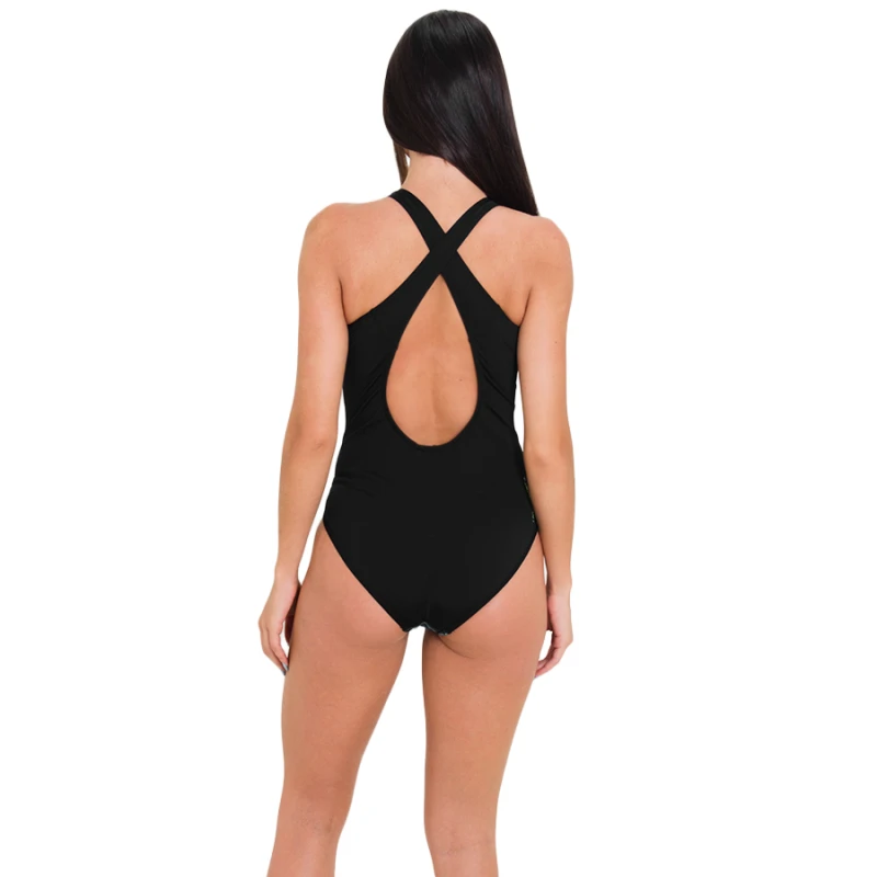 O maiô possui recorte aberto nas costas, que facilita na hora de vestir e proporciona flexibilidade aos movimentos.