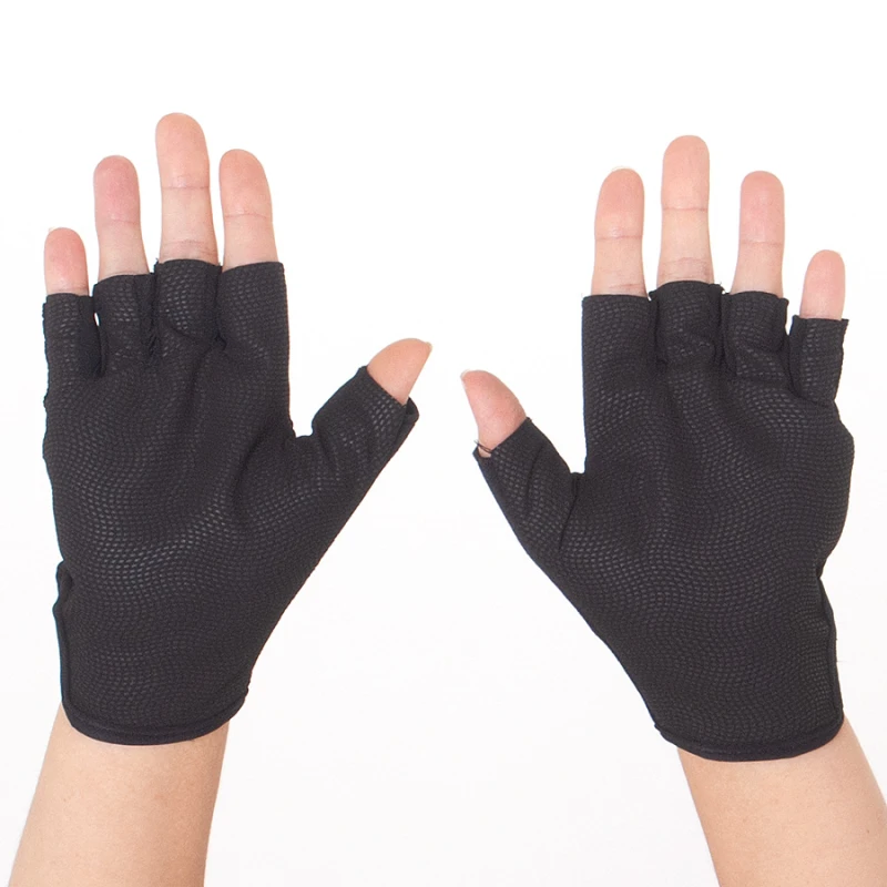 Dorso: 90% poliéster / 10% elastano; Palma: 55% nylon / 45% poliuretano com imitação de couro.