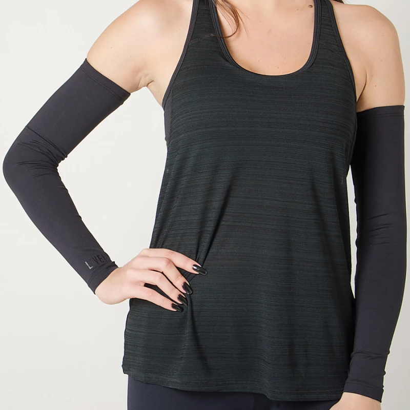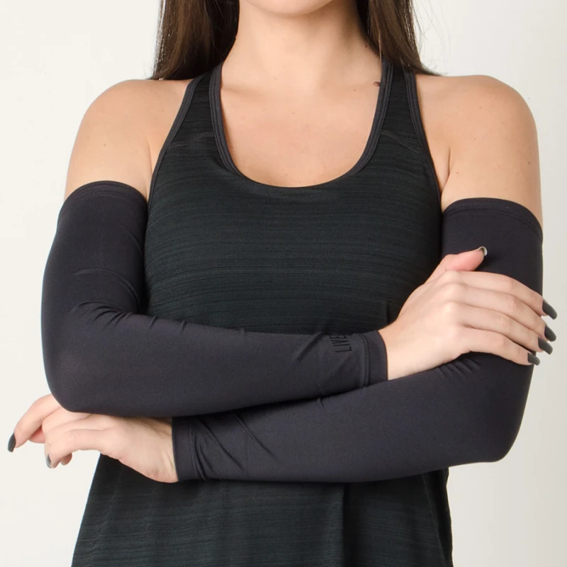 O Manguito Live Sleeve Running conta com tira de silicone aplicada em elástico interno, se adaptando ao formato do corpo.