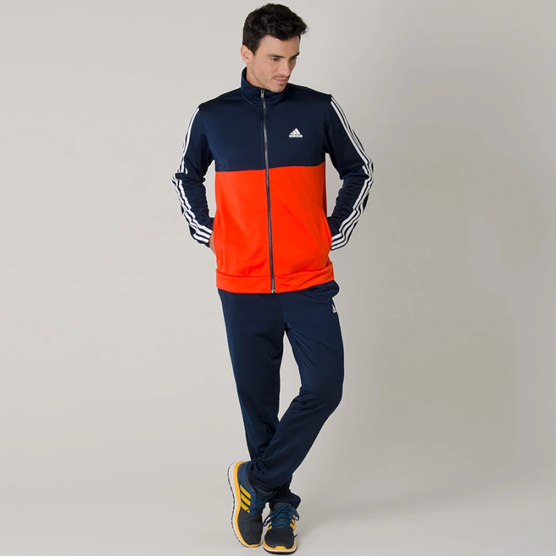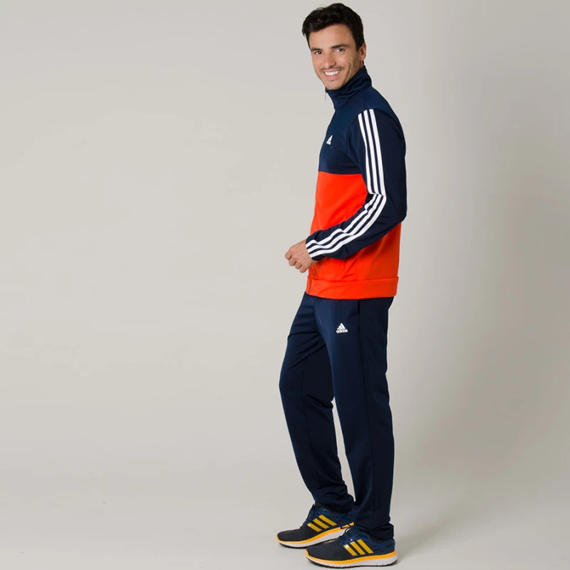 O destaque fica por conta das famosas três listras nos ombros da jaqueta, que inclui fecho de zíper, gola alta e punhos elásticos, já a calça possui corte afunilado e barra simples, conjunto ideal para os treinos ou dia a dia.