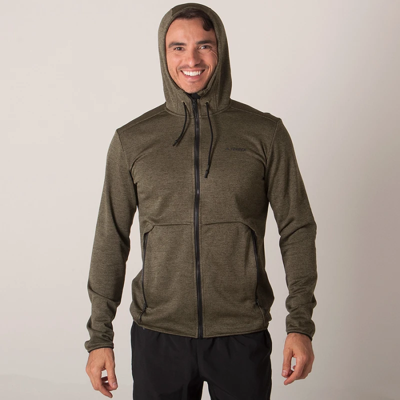 Conta ainda, com logo Terrex refletivo no peito, punhos e barra elásticos, fecho de zíper; gola alta e ajustável por cordão para proteção contra vento e chuva.