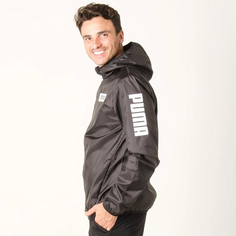 Confeccionada em 100% poliéster, a Jaqueta Corta Vento Puma Rebel Windbreaker Masculina possui logo Puma na manga, capuz e a praticidade de bolsos em zíper.