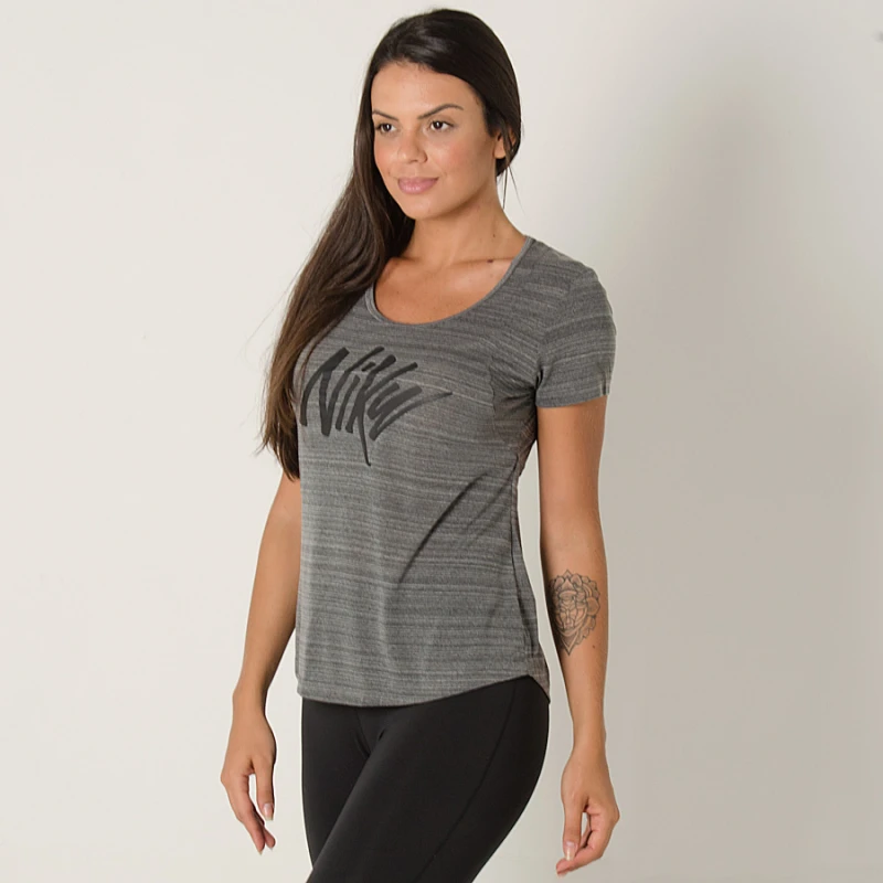 Medidas da modelo Jaqueline que veste a Camiseta Nike 10K Feminina na cor: Grafite no tamanho: P