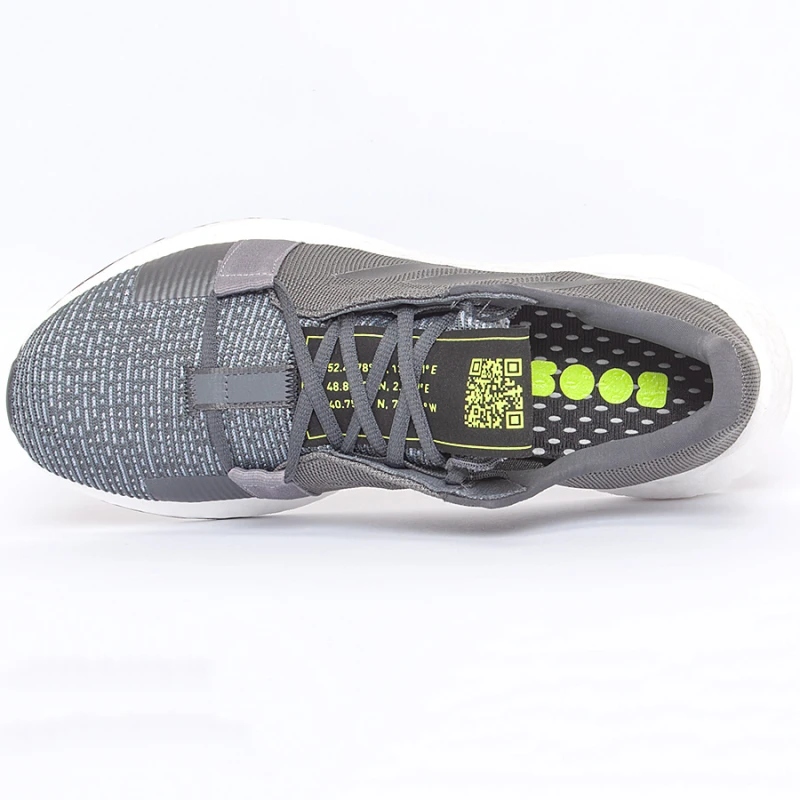 Os Tênis adidas Senseboost Go possui um QR CODE na língua, este QR CODE leva para uma playlist da adidas no Spotify.