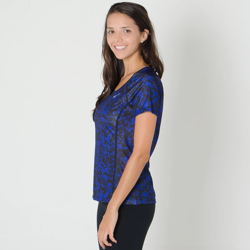 Medidas da modelo Tayse que a veste a Camiseta Nike Dry Miler Running Top Feminina na cor: Roxo/Preto no tamanho: P
