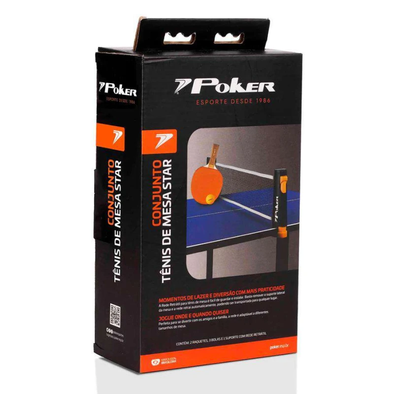 O conjunto de Tênis de Mesa Star, traz a facilidade e praticidade para praticar o tênis de mesa em qualquer ambiente: Contém 2 Raquetes, 3 Bolas e Suporte com rede retrátil.